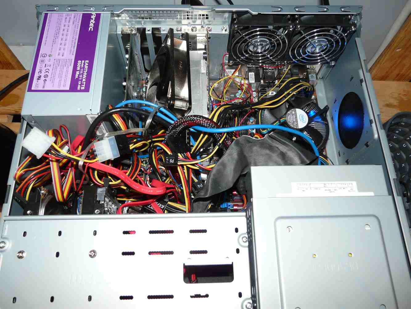 That is my rig. The Raidmax Iceberg case houses an Asrock P45R2000-Wifi motherboard, cradling an Intel E6850 at stock clocks. The pci-e x16 slot rocks a dated evga nVidia 8800 gtx. Underneath that monstrosity, I have a creative x-fi and a spare 80 gig Sata drive. Up top, we have an Ultra 1000 watt power supply and a generic 16x dvdrw.