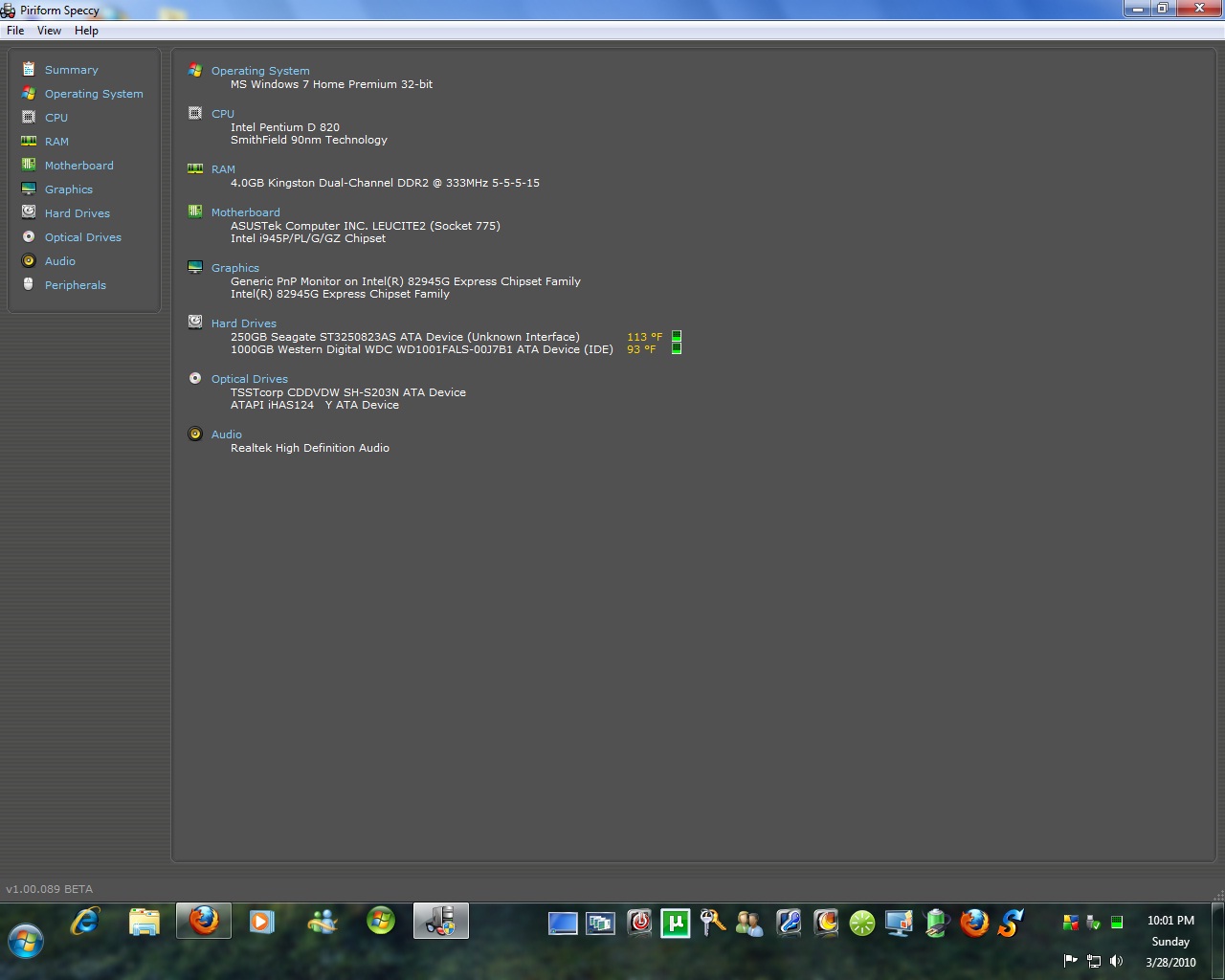 Is a hp media center with a Pentium d 820 when I got it it had the incredible amount of 1 GB of ram now has 4GB and is running W7 on a new 1TB hard drive I also replace the optical disc from IDE to SATA because the one it had die and the second was a crappy reader only I'll see if I can load some pictures