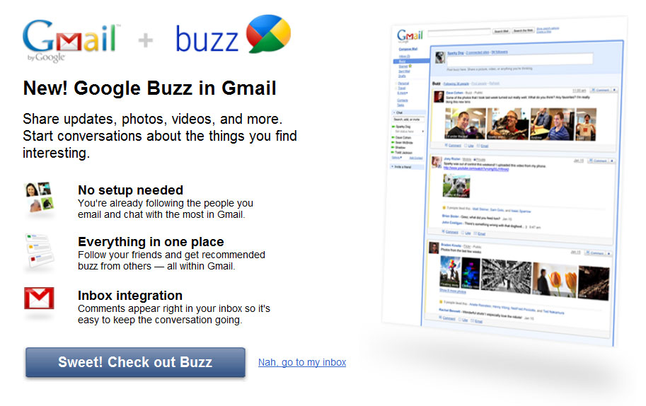 Google Buzz is a new way to start conversations about the things you find interesting. It's built right into Gmail, so you don't have to peck out an entirely new set of friends from scratch — it just works. If you think about it, there's always been a big social network underlying Gmail. Buzz brings this network to the surface by automatically setting you up to follow the people you email and chat with the most. We focused on building an easy-to-use sharing experience that richly integrates photos, videos and links, and makes it easy to share publicly or privately (so you don't have to use different tools to share with different audiences). Plus, Buzz integrates tightly with your existing Gmail inbox, so you're sure to see the stuff that matters most as it happens in real time.