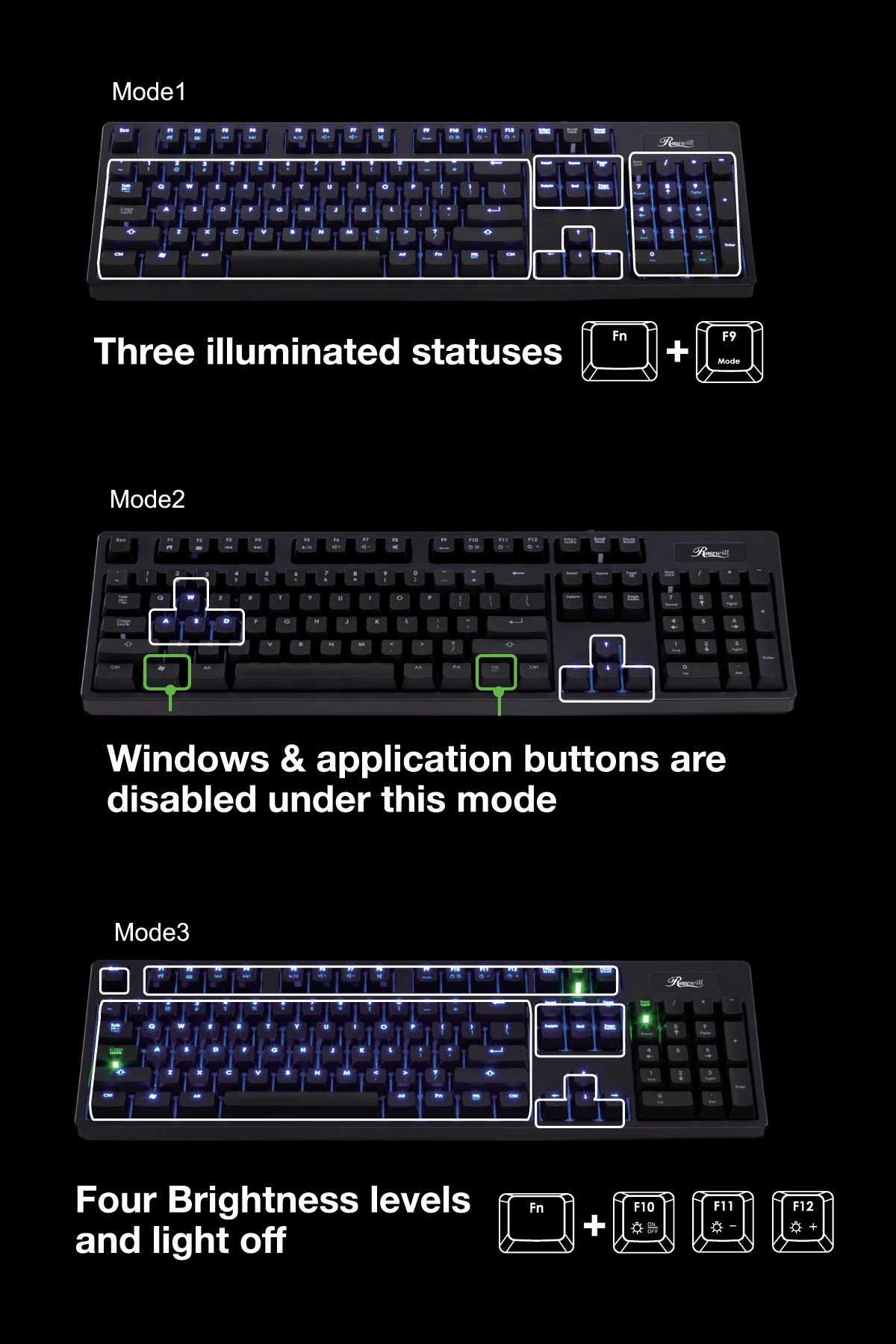 The Rosewill® Illuminated RK-9100 Series Mechanical Keyboard with world-class Cherry MX Switch design provides the user quick gaming response while offering the added bonus of a comfortable key stroke. Also, RK-9100 is equipped with individually backlit keys and anti-ghosting function which allows pressing any 6 keys simultaneously without key-in conflict. It features three illuminated status and four brightness levels. Moreover, RK-9100 series comes with gold plated USB connector to provide a long lasting high quality connection.