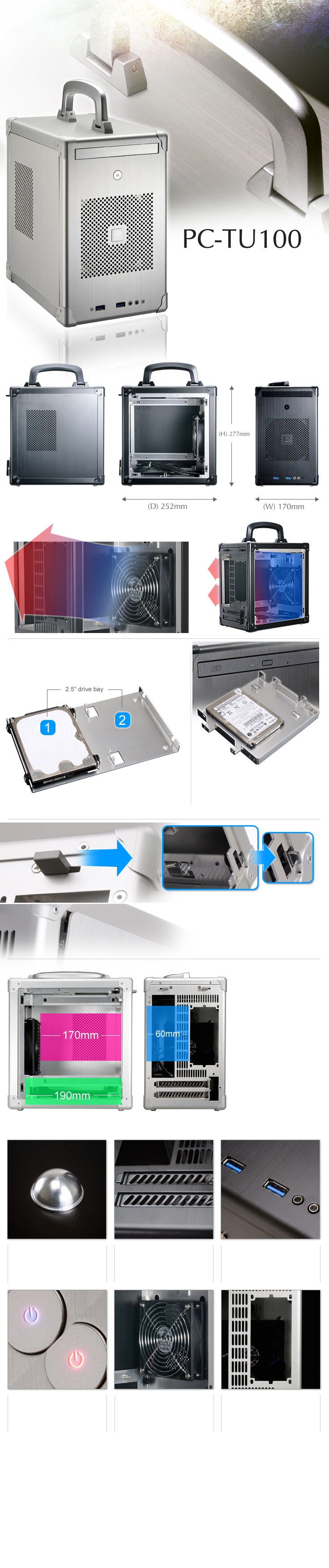 With dimensions of (WxHxD) 158 x 275 x 242mm (6.2” x 10.8” x 9.5”) and a weight of 1.77kg (3.9lb), the PC-TU100 holds the hardware necessary for a portable gaming system while being primed and ready for transport. Two 2.5” hard drives or SSDs can be mounted on the bottom drive rack. An additional 2.5” drive can be placed in the slim optical drive bay, if no optical drive is installed.