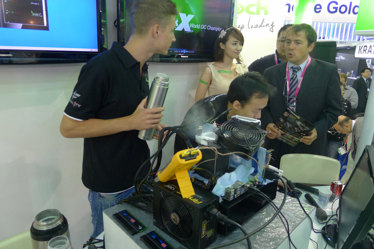 The world champion overclocker Nick Shih and German No.1 overclocker SuicidePhoenix operated 3DMark05 test with Z77 OC Formula, the first overclocking-specialized motherboard developed by Nick Shih. This is also the debut of Z77 OC Formula. With its serious compute power, Z77 OC Formula enabled Nick Shih and SuicidePhoenix overclock Intel Core i7 3770K processor in low temperature with great stability which stunned the on-site audience. The striking OC performance successfully drove the pass-by attention and brought a lot of traffic to ASRock booth.