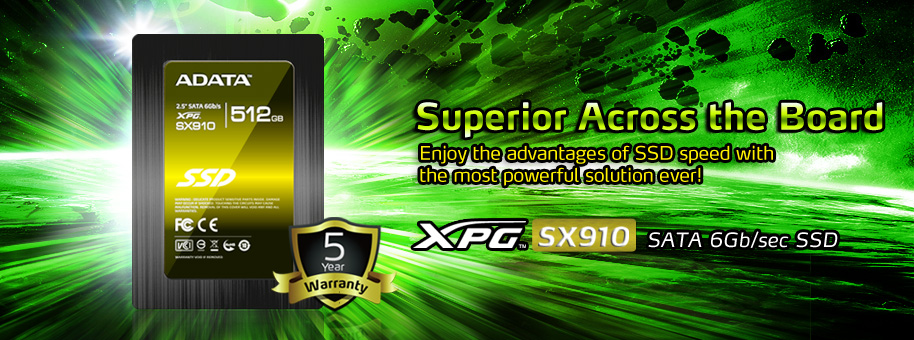 ADATA Technology, a leading manufacturer of high-performance DRAM modules and NAND Flash storage application products, today announced the launch of the XPG SX910 solid state drive, a significant broadening of the popular and powerful XPG line of storage products. The SX910 features a 7% capacity increase over common SSDs that use a SandForce controller, delivering a powerful combination of capacity and high performance with a five-year warranty.