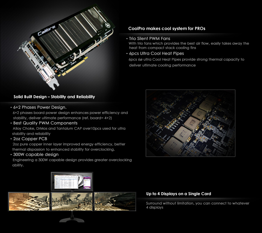 Calibre X680 & X670 Captain Series is built for enthusiasts only, with tons of expensive gears design, ready to tackle all the hungry gamers’ demands. By utilizing CoolPro Cooling System, Triple Silent PWN Fans with specialize Compact Stack Fin Heat Sinks optimizes air flow through 6mm six ultra cool heat pipes design provides strong thermal-hydraulic cooling performance. Furthermore, 6+2 Phases power design provides stability at load, while 2oz Copper PCB delivers better energy efficiency and stability for overclocking. Moreover, with all solid built components design, Calibre X680/X670 Captain Series delivers the extremely gaming experience like never before.