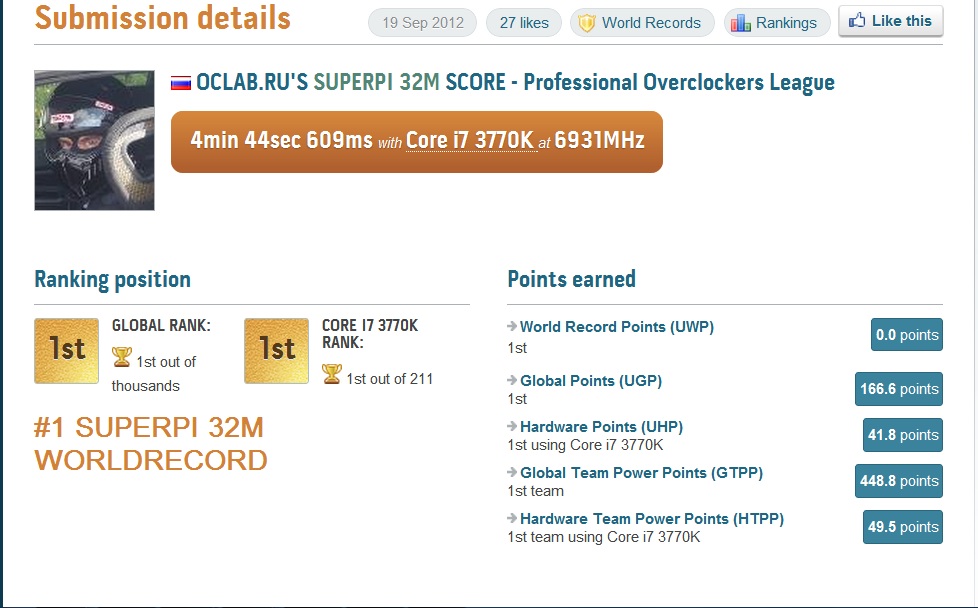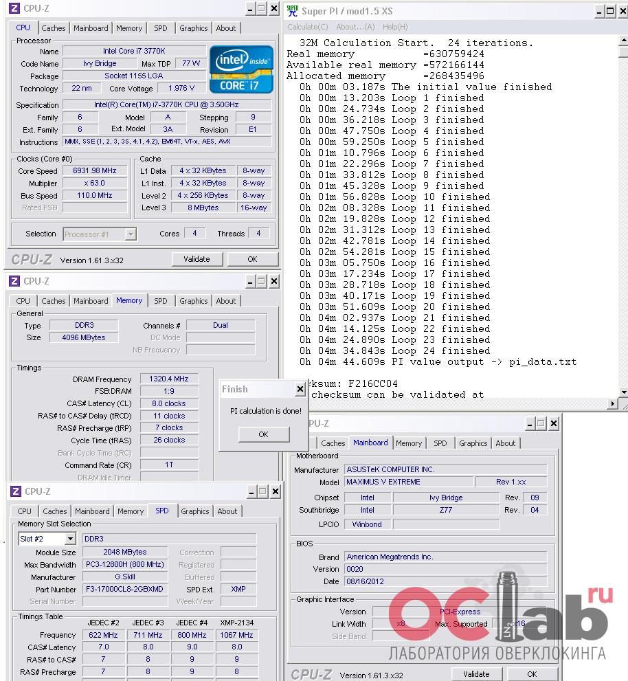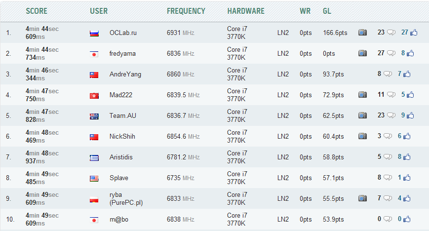 4m 44.609s – The world’s fastest SuperPI 32M score achieved by the renown Russian overclocking team, OCLAB.RU, with G.SKILL RipjawsX DDR3 memory, Intel Core i7 3770K CPU and ASUS Z77 Maximus V Extreme motherboard