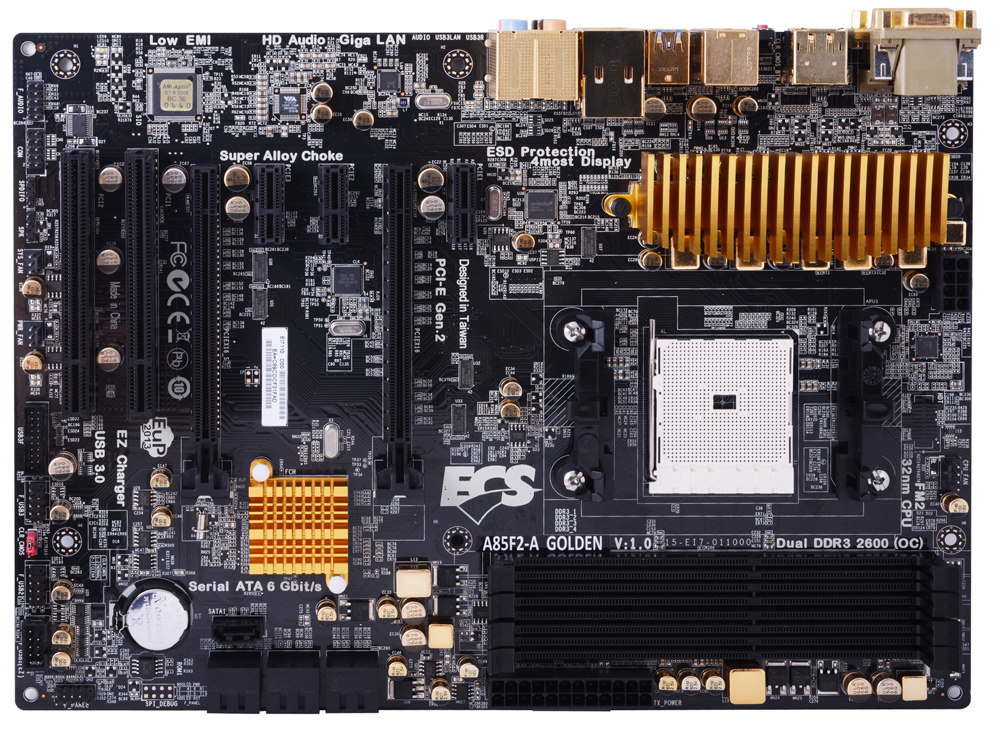 ECS A85F2-A GOLDEN is certified by ECS Nonstop Technology for the ultimate stability and reliability. ECS Nonstop Technology deliver a hassle-free computing experience by solving common PC hardware problems before they can even occur. Hardware enhancements and a strict series of specially-designed tests combine together to protect PCs and ensure that all ECS Nonstop Certified motherboards can be relied on for stability and reliability far into the future, long after competing products have failed. Nonstop features include enhanced gold plating on critical contacts, and all solid capacitors and Electrostatic Discharge (ESD) protection for VGA, USB, LAN and HDMI ports.