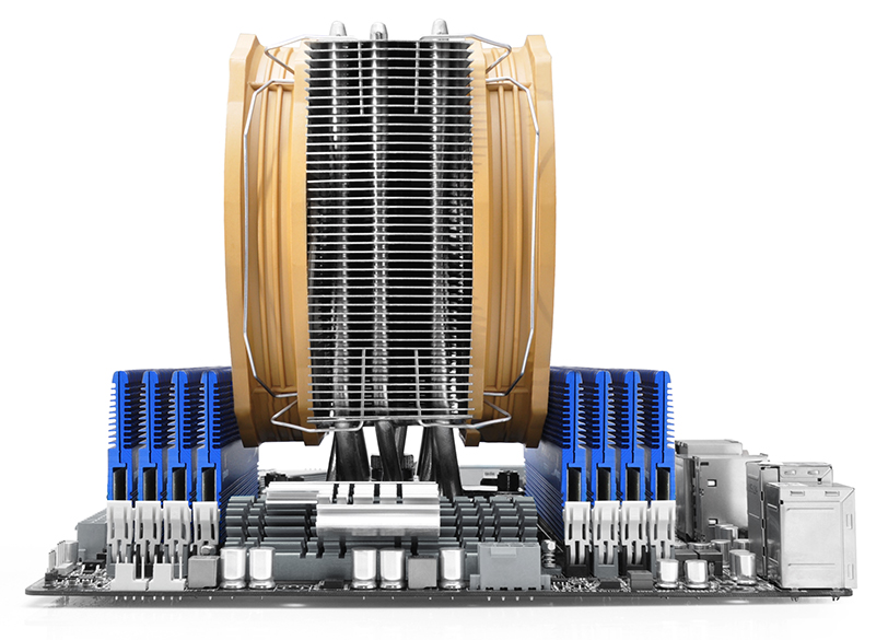 A: You can refer to the image at the bottom, with the full width of the Archon SB-E X2 and two TY-141’s. The total width is only 10.3cm, on socket LGA2011 for example the spacing between the two RMA slot sections is 11cm. So even on the crowded LGA2011 socket you won’t run into any RAM compatibility issues!