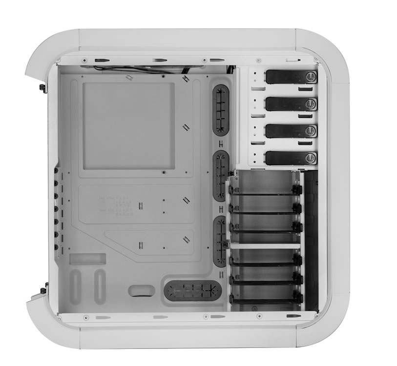 Survivor White features a hideaway carry handle that locks into place when you need mobility, and easily folds down when you don't. The removable hard drive cage accommodates extra-long graphics when removed or up to seven 2.5” SSD drives or six 3.5” hard disks when intact. And to keep things cool, space for up to two 200mm fans or three 120mm fans is included as well.