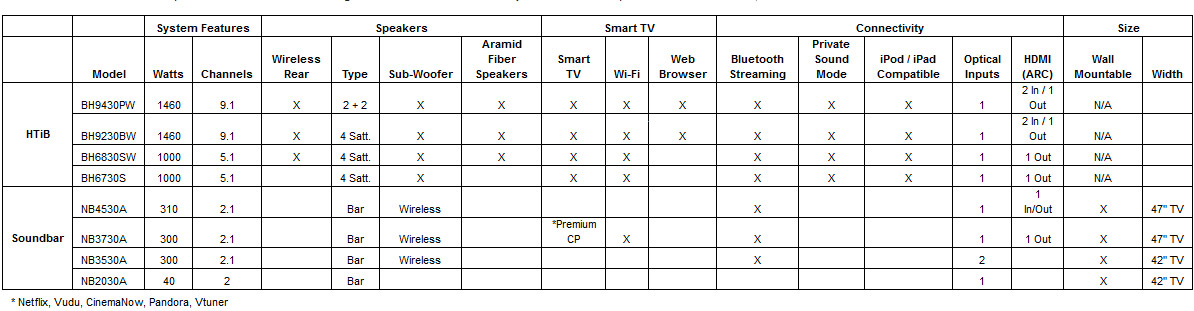 Also serving as a smart hub, the BH9430PW supports Near Field Communication (NFC), which offers wireless and seamless content mirroring from smartphones and other compatible external devices. In addition, it has other excellent Smart TV capabilities such as web browsing*. Additional Home Theaters Systems in the lineup include the BH9230BW, BH6830SW and BH6730S.