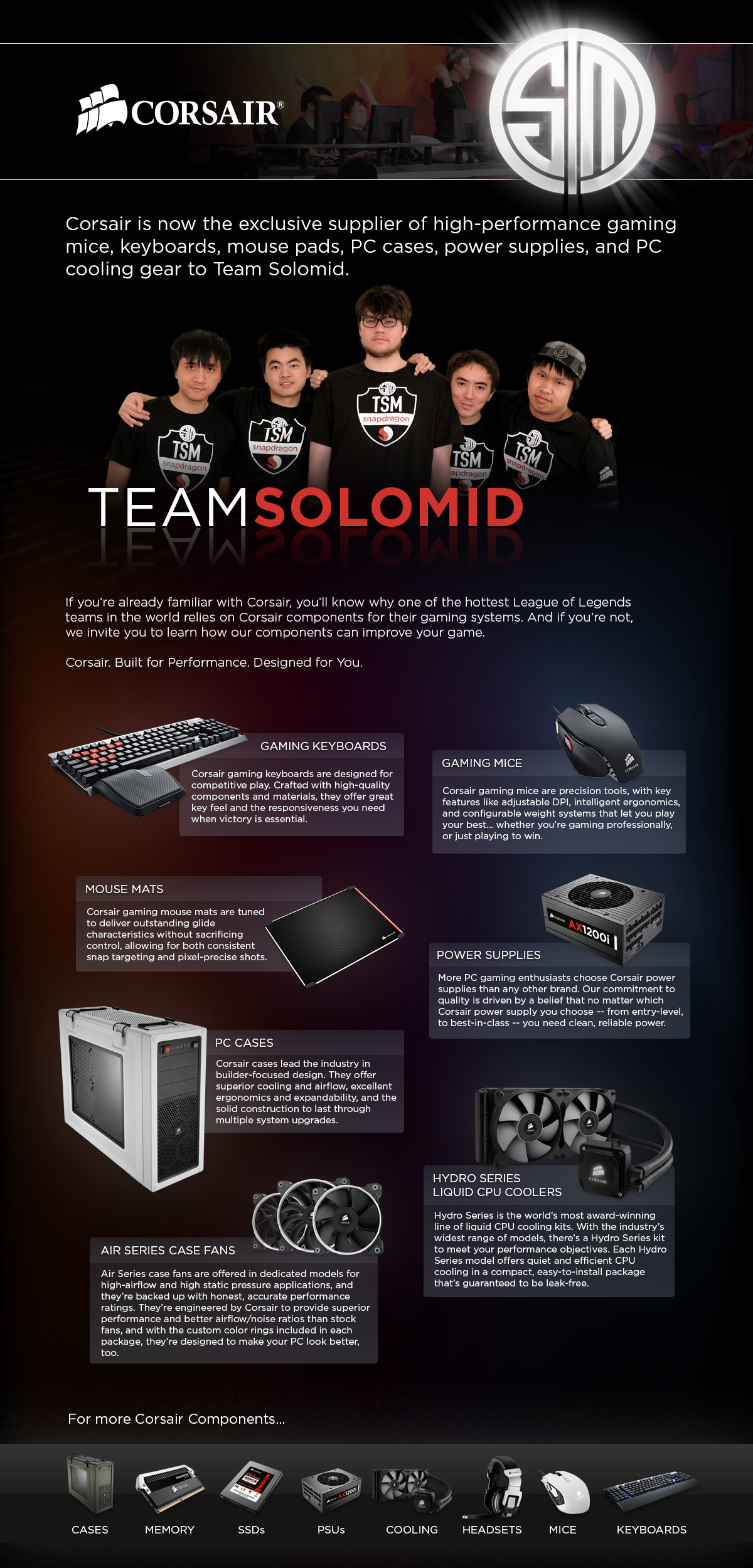 Every month, Corsair and Team SoloMid will be holding promotions and contests featuring Corsair products. To find out more, visit corsair.com/TSM.