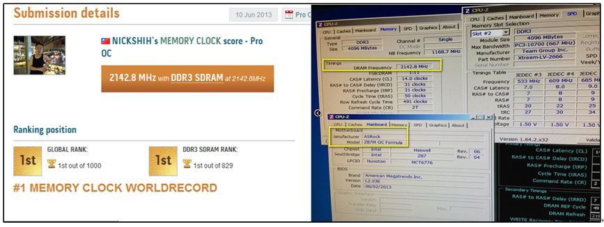 TAIPEI, TAIWAN, June 10, 2013 – The one and only ace of overclocking Nick Shih continues to push DDR3 memory frequencies to new boundaries which no man has ever set foot on. He has reached a ludicrous DDR3 4285.6MHz with ASRock’s Z87M OC Formula, the micro sized Z87 motherboard he designed specifically for overclocking, and it all happened on this year’s overclocking show at COMPUTEX TAIPEI 2013!