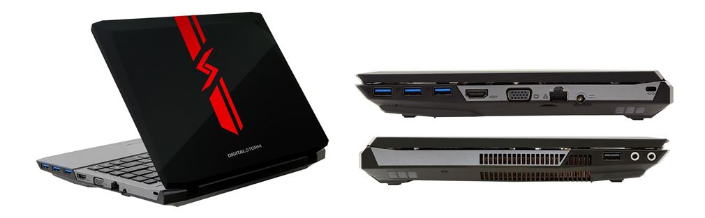 VELOCE’s aggressive aesthetic matches its powerful configuration, with Digital Storm’s signature finish featuring a blood red logo slicing across the notebook’s black top cover. A cold silver and grey interior surrounds the backlit keyboard.