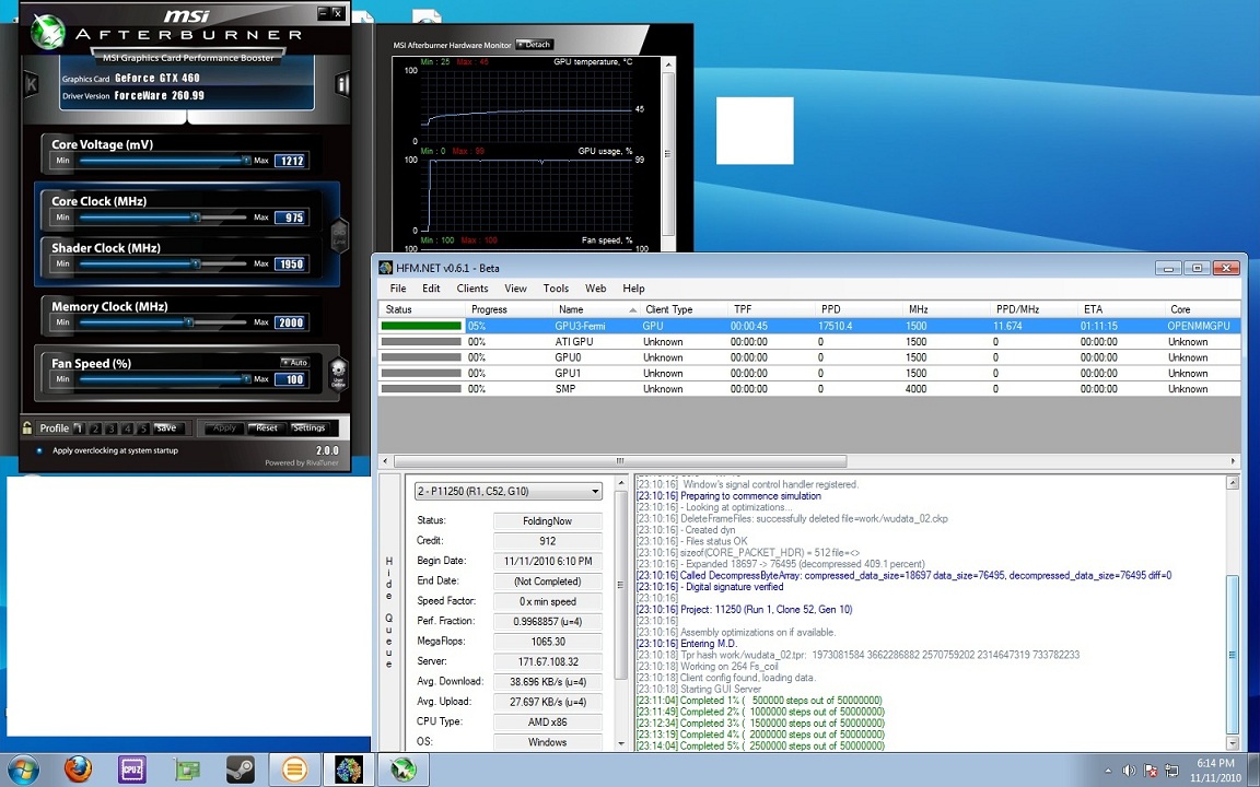 Did I mention the card is overclocked? A stock NVIDIA GeForce GTS 450 runs at 783MHZ core, 1566MHz shaders, 902MHz memory. I've got mine overclocked to 962MHz core, 1925MHz shaders, 1000MHz memory and to be honest they card might have more as I have pushed it to become unstable yet with F@H.