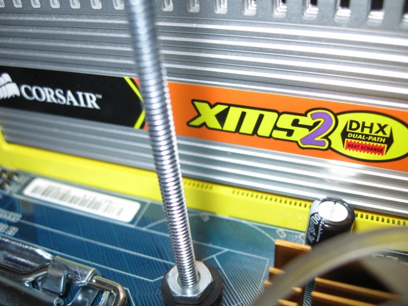 got that nice chunk of copper with the pot so that the chilled alcohol can transfer temp to it, which will allow the pot to cool the CPU for longer without having to use more DICE (ie, give it more mass). the piece of MDF there is an early pic of my trial mount, the corners of the square mark LGA775 mounting holes