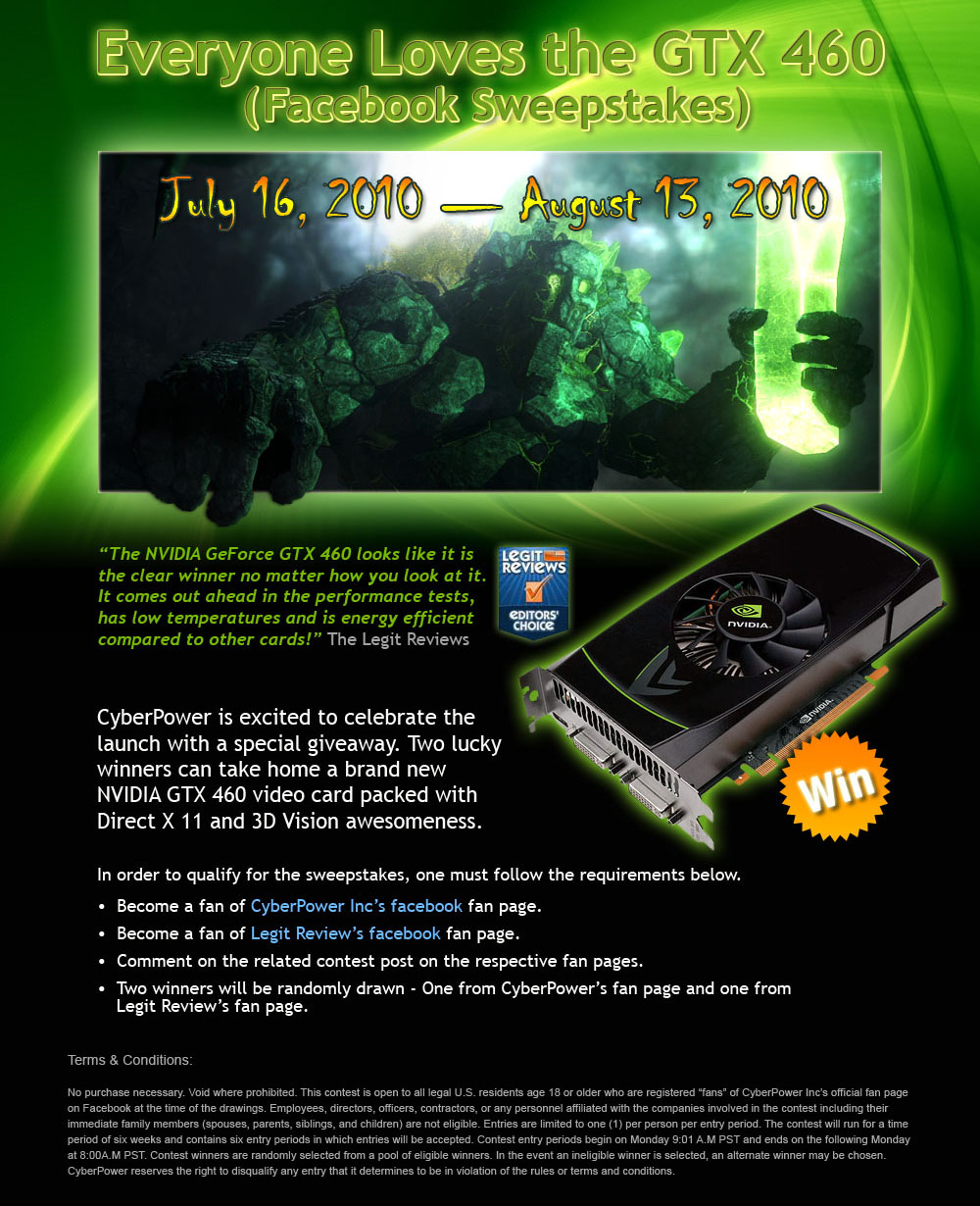 As a launch partner, CyberPower is excited to offer this product for customizing and configuring. On top of that, CyberPower wants to celebrate the launch with a special giveaway. Two lucky winners can take home a brand new NVIDIA GTX 460 video card packed with Direct X 11 and 3D Vision awesomeness.