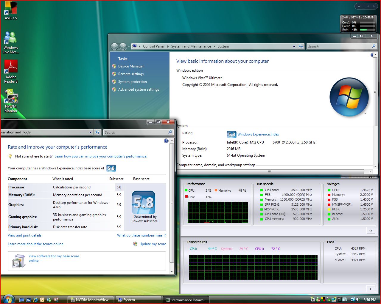 No overclocking whats so ever, using air cooling standard on everything , but the cpu has a Zalman CNPS9700LED (Copper) CPU Cooler with artic silver thermal paste.