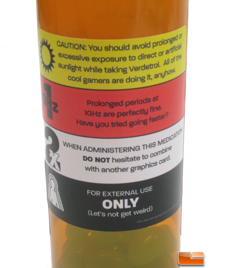 The bottle says that the pills are for natural performance enhancement and that we are to give our video card 1 tablet by the fan intake four times a day. This is obviously a marketing promotion for an upcoming product release of a video card that is clocked at 1GHz. The AMD Radeon HD 7770 (Cape Verde) is said to run at 1GHz, so this could mean that the Radeon HD 7770 is very close to launching. The label on the bottle was well done with 28 doses (28nm manufacturing process), a prescription number of 1337-2012 (if you don't know what 1337 means hit alt+f4) and that the tablets are 1GHz (the core clock speed of an upcoming product). We'll let you guys guess the meaning of Verdetrol, but NVIDIA's colors are green. You can see more pictures of the bottle label by following the link below to the forums.