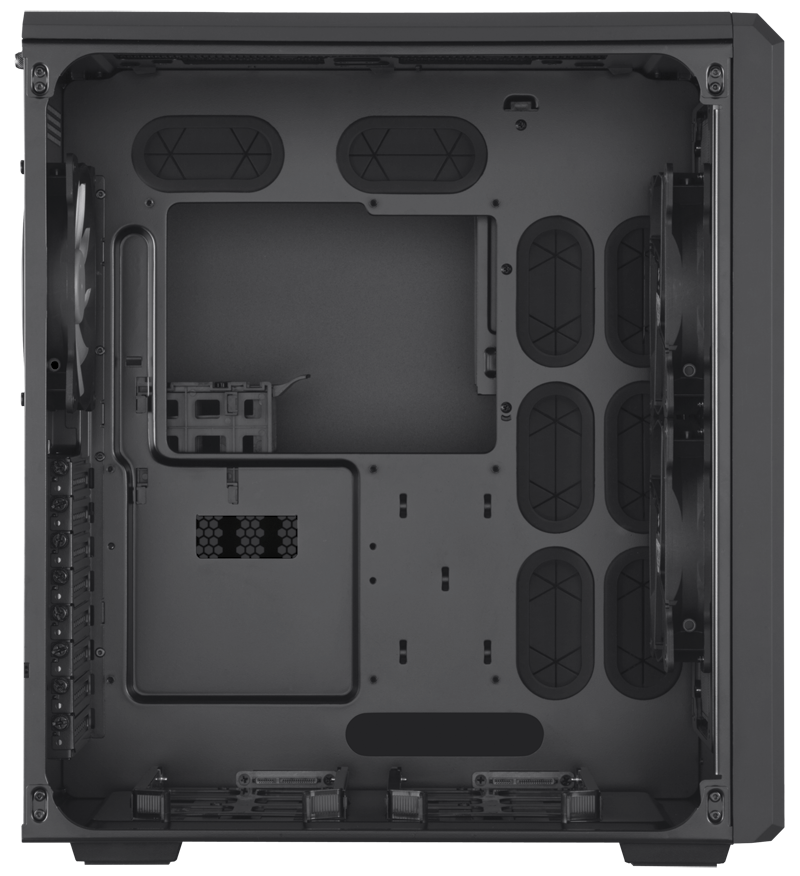 The main chamber of the Carbide Series Air 540 houses the motherboard and hot-swap 3.5” drives for superior drive cooling and quick swapping. The second chamber holds the power supply, SSDs, and 5.25” drives behind the motherboard tray. The separate compartments make building a breeze and provide cleaner cable routing and superior cooling for system devices. In addition, layout in each chamber is optimized to limit obstructions and streamline airflow from the intake fans to the hottest PC components, resulting in lower temperatures and noise levels.