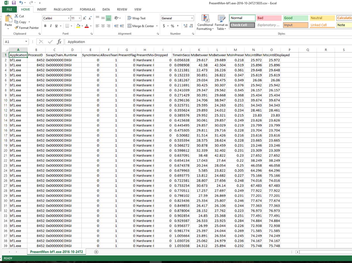 Using Presentmon to benchmark video cards is extremely time consuming. You don't get an FPS score you get a CSV file like this: