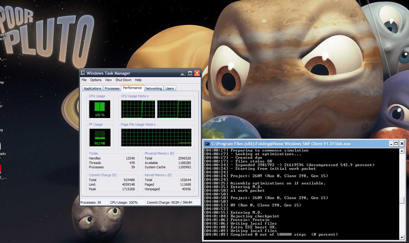 So I sent in my 100th wu today and I'm still working on getting my second amd athlon 64 x2 up and running as the harddrive is messed up and windows doesn't stay too stable for that reason. keep getting hd errors when I get the new hd I'll boot it up and get it folding for a while as a burn in at the least. don't know if I can justify to my parents having 4 machines of mine folding all the time. my p4, athlon xp, and my fx-60 are all currently 80% of the time just folding graphical.